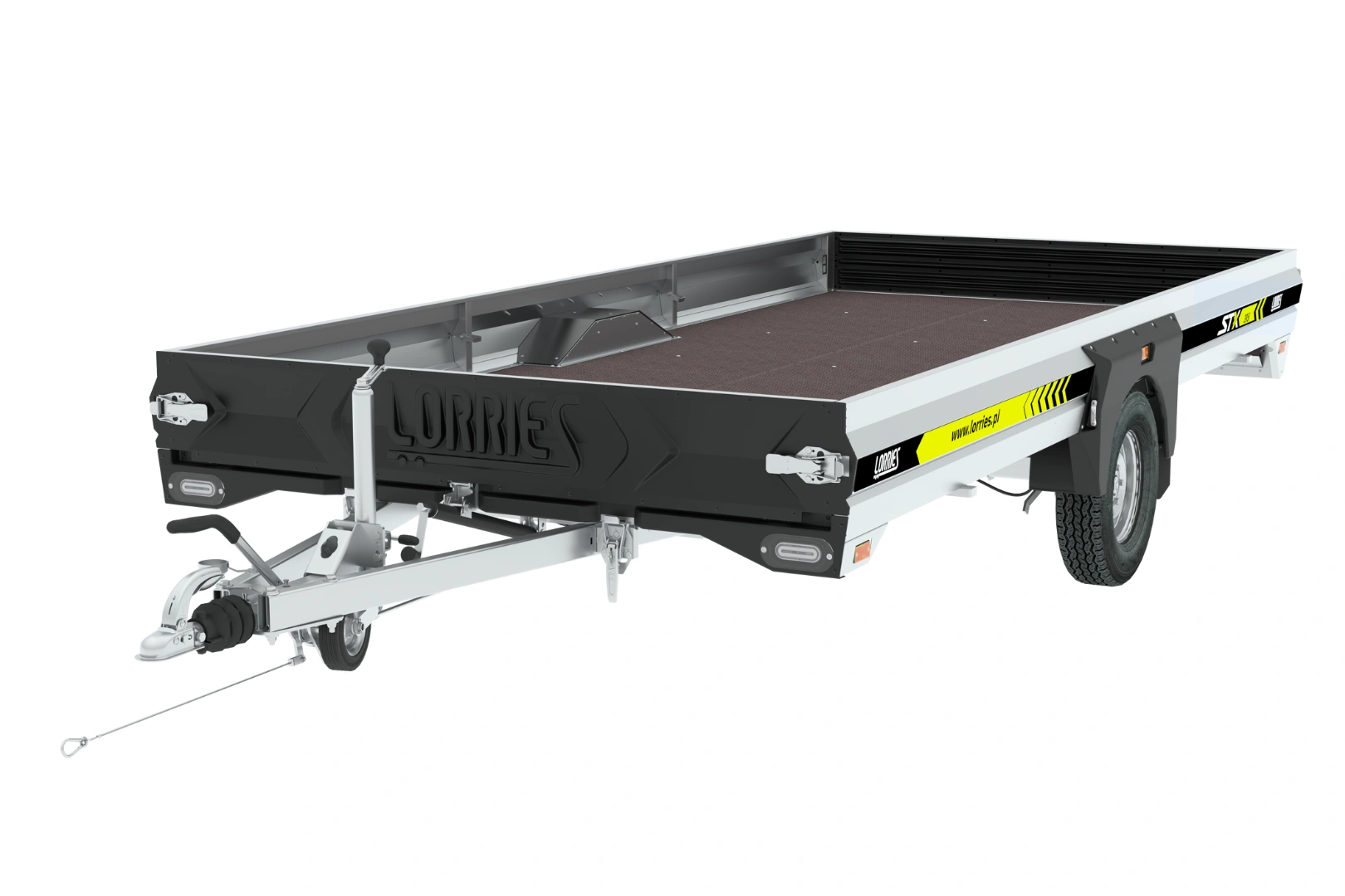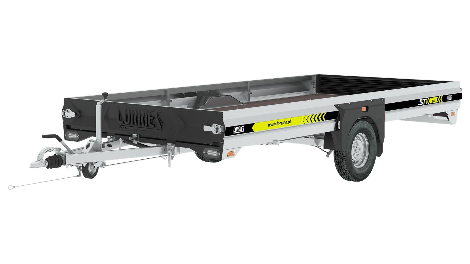 Przyczepa STX395I posiada przestronne pole załadowcze. Wyposażona jest w stalowe burty o wysokość 25 cm, z których przednia i tylna są otwierane i w pełni demontowalne. Boczne burty stanowią elementy konstrukcyjne i są zamontowane na stałe. W celu uchylenia platformy używamy mocnego podnośnika trapezowego, który stanowi standardowe wyposażenie.